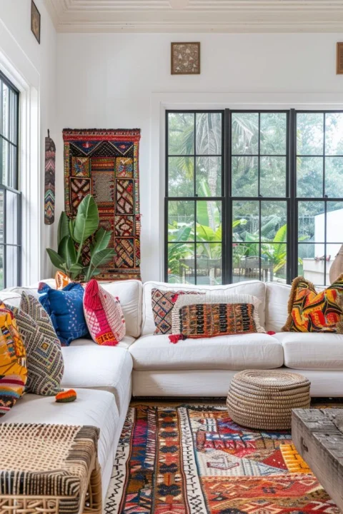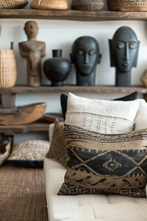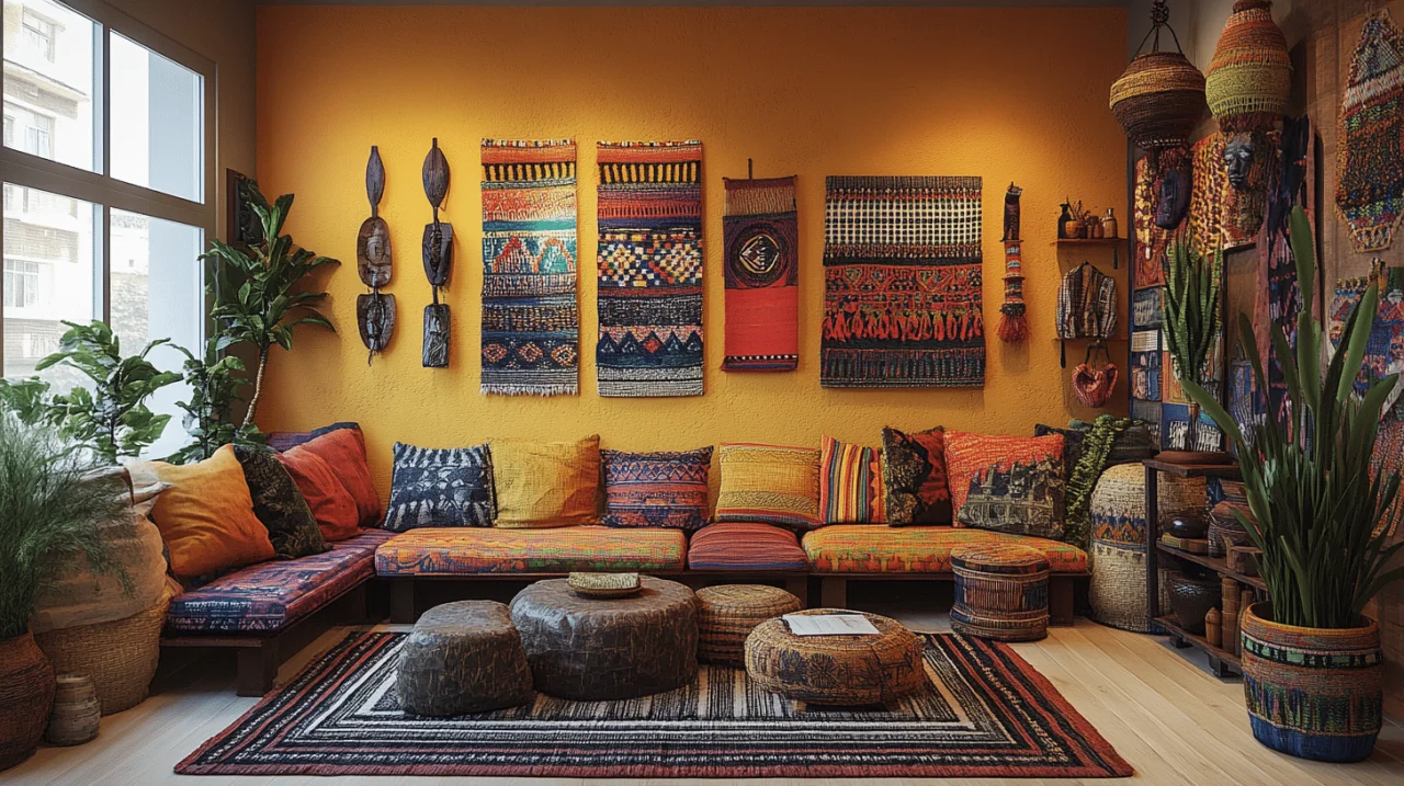 Afrohemian dekorasyonun en dikkat çekici unsurlarından biri etnik desenlerdir. Geometrik formlar, tribal motifler ve el çizimi detaylar mekâna enerjik bir karakter kazandırır.