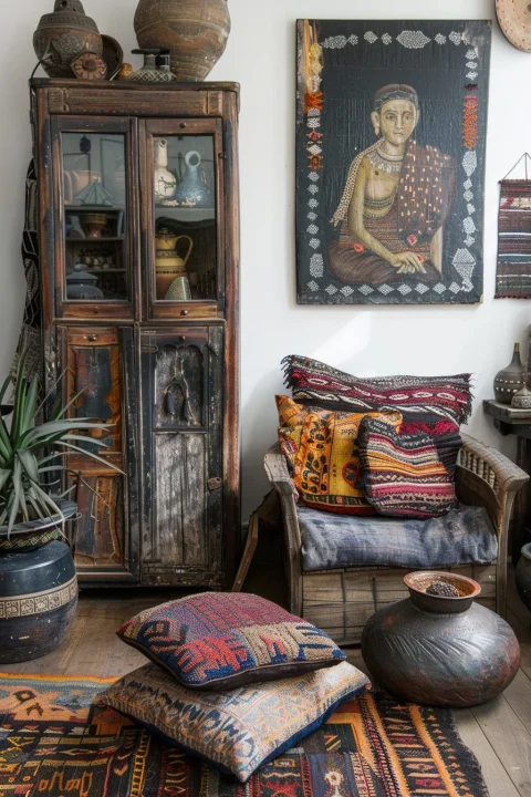 - Duvarlarda etnik baskılı tablolar veya el dokuması tekstiller