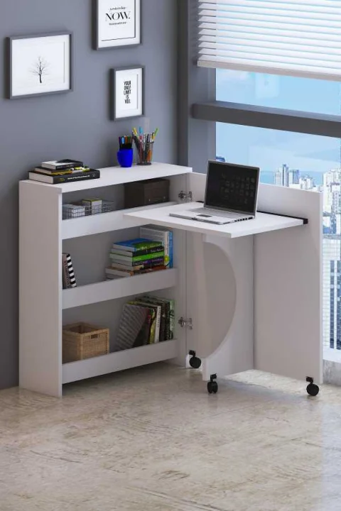 Evden çalışma alışkanlığının artmasıyla birlikte ergonomik ama minimal çözümler öne çıktı. Raflı çalışma masaları; kitaplar, dosyalar ve dekoratif objeler için ekstra depolama alanı sunarken, masanın sade kalmasını sağlar. Bazı modellerde masa kısmı kullanılmadığında katlanarak rafa dönüşür — gündüz ofis, akşam yaşam alanı.