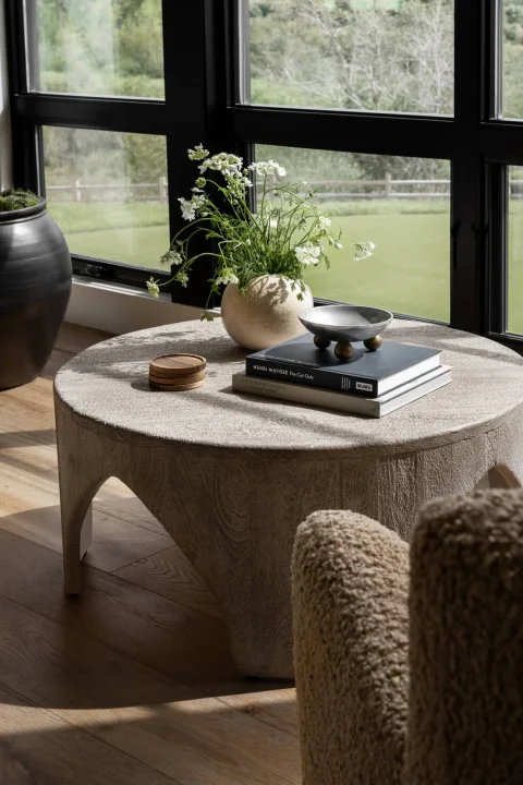 Doğal taş ve ahşap yüzeylerle desteklenen yuvarlak mobilyalar; mekânı hem zarif hem de sıcak kılar.