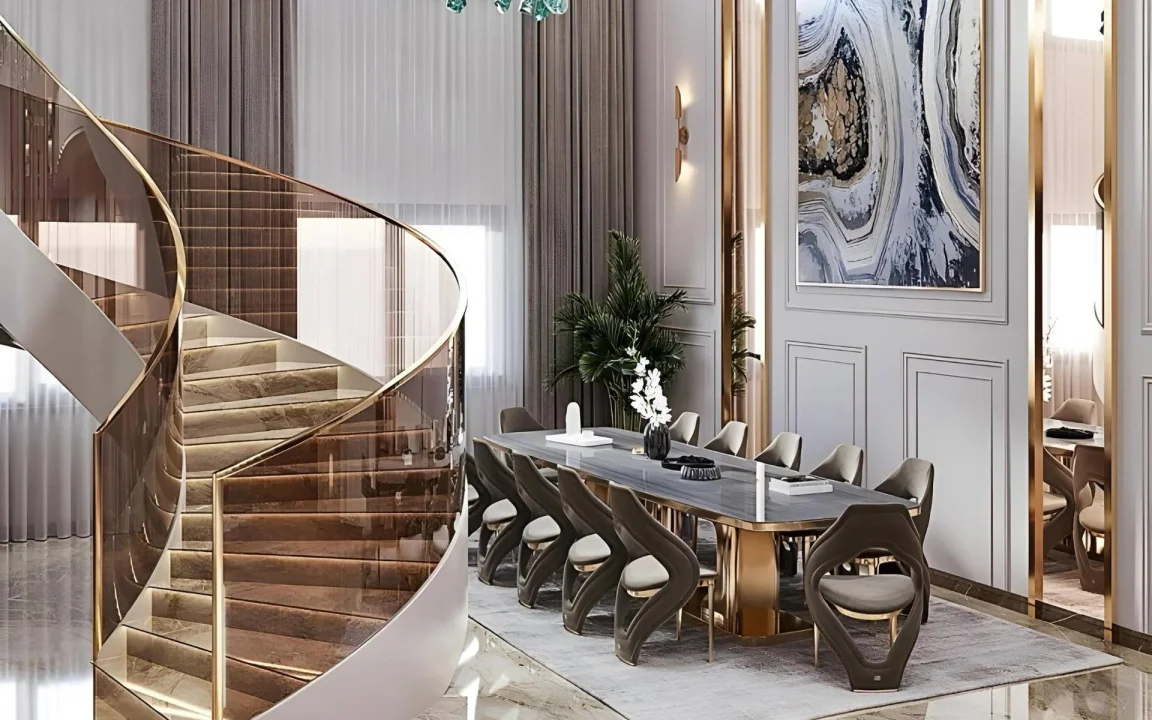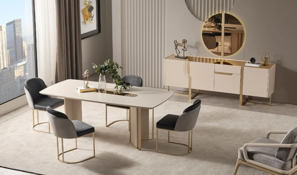Modern çizgiler sade görünse de etkisi büyük. İnce metal detaylar, yumuşak hatlı masa ayakları ve zarif geometriler, yemek odasına fark edilir bir karakter katıyor. Bu yaklaşım sayesinde dekorasyon; gösterişten uzak ama güçlü bir duruşa sahip oluyor.