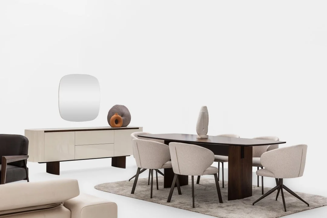 Polo Mobilya’nın geniş koleksiyonunda yer alan modern yemek odası takımı modelleri; masa, sandalye, konsol ve vitrin seçenekleriyle eksiksiz bir kombin sunar. Modern çizgilerin yanı sıra konforlu oturum sağlayan sandalye tasarımları, uzun sohbet ve keyifli yemeklerin rahatlığını artırır. Modellerde kullanılan mermer efektli yüzeyler, metal detaylar ve dokulu kapaklar, mekâna lüks bir görünüm kazandırır. Şık depolama çözümleri ve fonksiyonel detaylar da hem görsel hem de kullanım açısından avantaj sağlar.